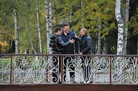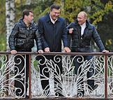 Официальная встреча президентов Украины и России прошла в неформальной обстановке. Слева направо: президент России Дмитрий Медведев, председатель правительства России Владимир Путин и президент Украины Виктор Янукович во время прогулки в государственной резиденции "Русь" в "Завидово".