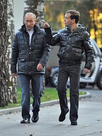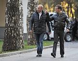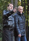 Председатель правительства России Владимир путин (слева) и президент России Дмитрий Медведев (справа) во время прогулки в государственной резиденции "Русь" в "Завидово".