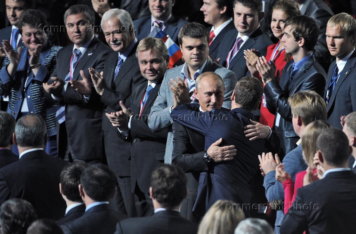 XII Congress of the United Russia Russian political party in Luzhniki. Russian Prime Minister Vladimir Putin (left) and Russian President Dmitry Medvedev (right) at a meeting of the Congress.