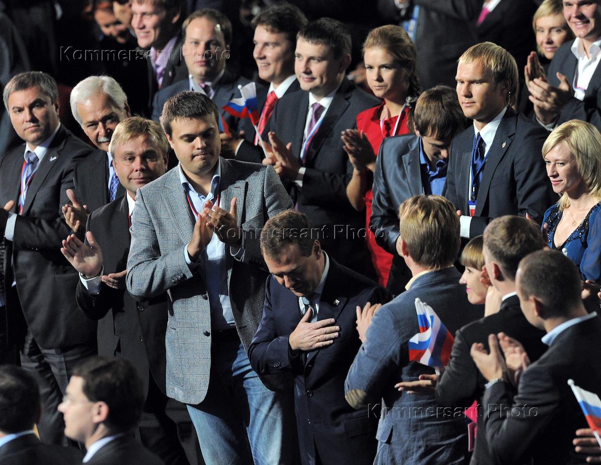XII съезд Всероссийской политической партии "Единая Россия". Президент России Дмитрий Медведев (в центре) на заседании съезда в спортивном комплексе "Лужники".