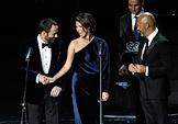 Пресс-секретарь правительства России Дмитрий Песков (слева) и генеральный директор телеканала "Дождь. Optimistic Channel" Наталья Синдеева (справа) на церемонии вручения премии журнала GQ "Человек года 2011". Церемония прошла в Российском академическом молодежном театре (РАМТ) .