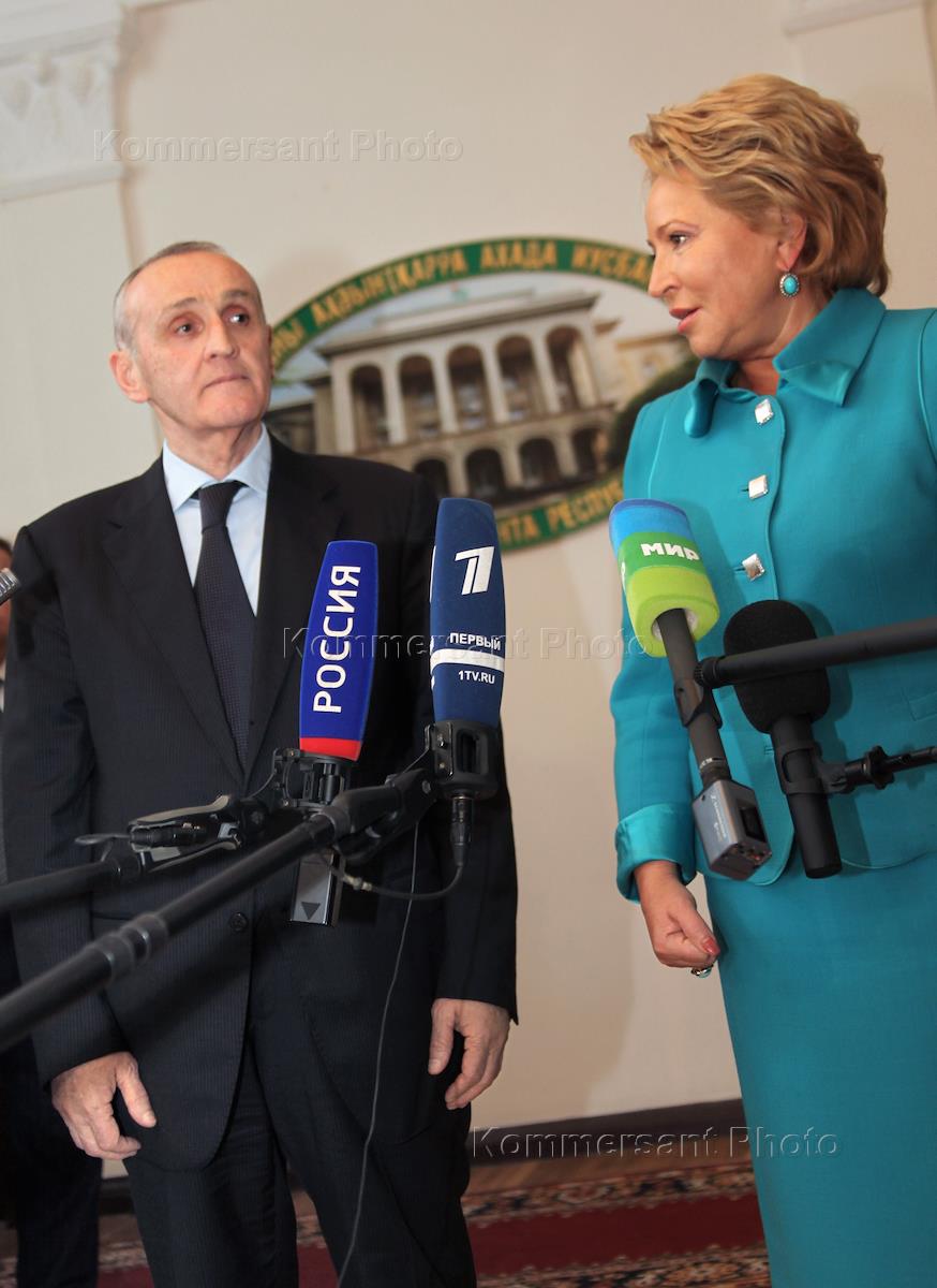 Инаугурация президента Республики Абхазия. Президент Республики Абхазия Александр Анкваб (слева) и председатель Совета Федерации России Валентина Матвиенко (справа) во время церемонии.