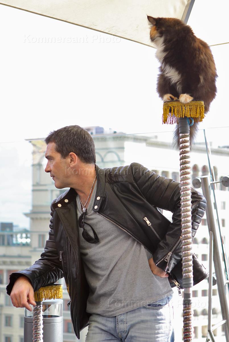 Голливудский актер Антонио Бандерос перед началом пресс-конференции, посвященной выходу в прокат мультфильма "Кот в сапогах 3 D". Пресс-конференция прошла в отеле "Ритц Карлтон".
