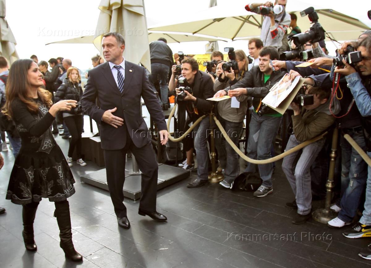 Голливудские актеры Антонио Бандерос (слева) и Сальма Хайек (справа) перед началом пресс-конференции, посвященной выходу в прокат мультфильма "Кот в сапогах 3 D". Пресс-конференция прошла в отеле "Ритц Карлтон".
