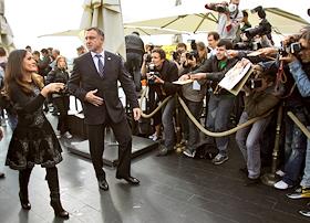 Голливудские актеры Сальма Хайек (слева) и Антонио Бандерас (справа) перед началом пресс-конференции, посвященной выходу в прокат мультфильма "Кот в сапогах 3 D". Пресс-конференция прошла в отеле "Ритц Карлтон".