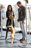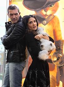 Голливудские актеры Сальма Хайек (слева) и Антонио Бандерос (справа) перед началом пресс-конференции, посвященной выходу в прокат мультфильма "Кот в сапогах 3 D". Пресс-конференция прошла в отеле "Ритц Карлтон".