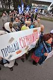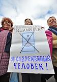 Участники акции движения "Старшее поколение" на Новопушкинском сквере. Плакат с надписью "Сберкнижка- прошлый век! Я современный человек!".