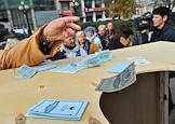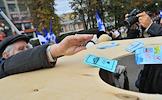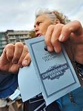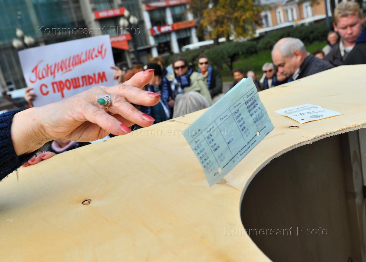 Участники акции движения "Старшее поколение" выбрасывают в урну старые сберегательные книжки Сбербанка России. Акция прошла на Новопушкинском сквере.