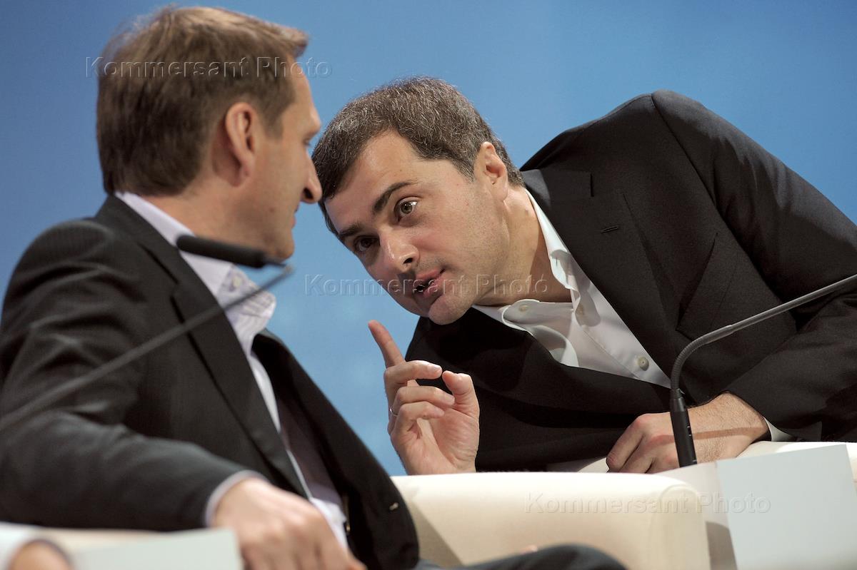 Первый заместитель руководителя администрации президента России Владислав Сурков (слева) и пресс-секретарь правительства России Дмитрий Песков (справа) на VI Всероссийском Медиафоруме в Центре международной торговли (ЦМТ).
