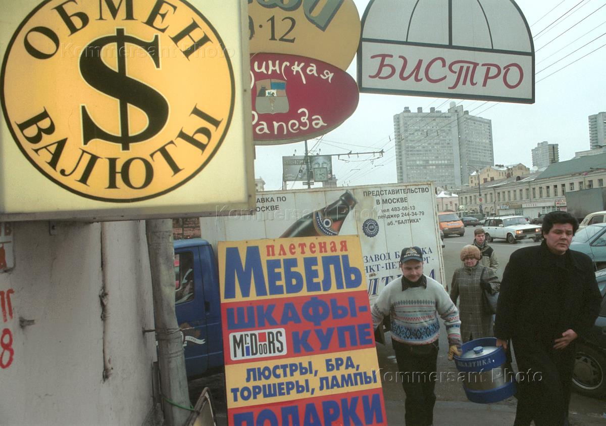 A man and a boy carry a barrel of beer under sign boards 'Exchange', 'Bistro', 'Furniture' at Smolenskaya square.