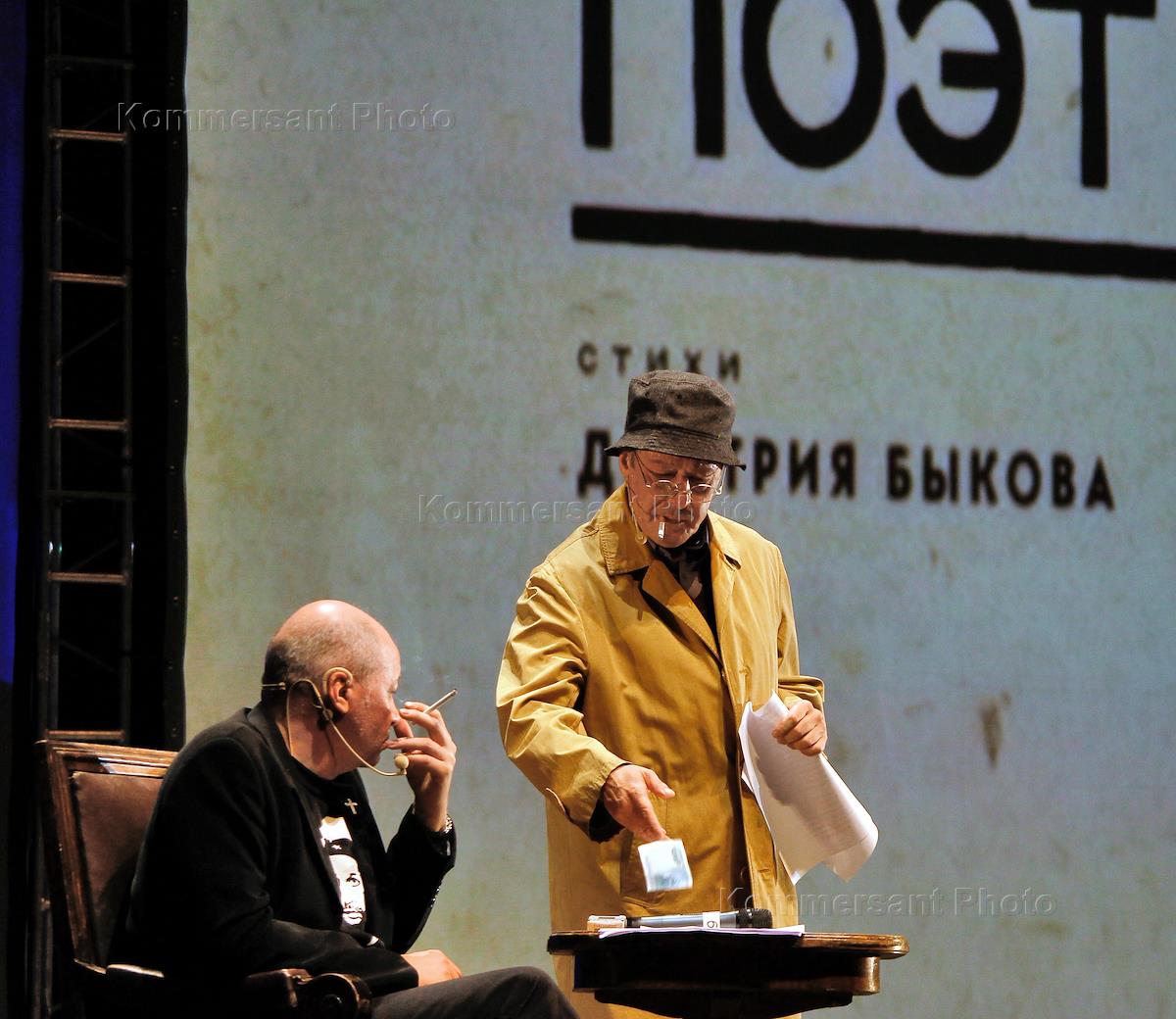 Артист Михаил Ефремов (слева) и писатель Дмитрий Быков (Справа на экране) во время выступления в ньюзикле "Гражданин поэт" в КЗ "Барвиха Luxury Village".