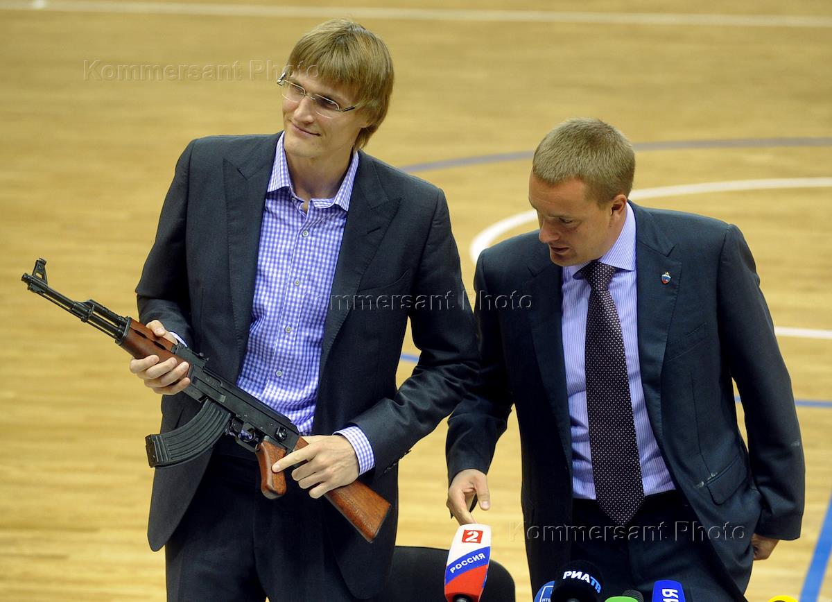 Баскетболист Андрей Кириленко (слева) на презентации нового состава баскетбольной команды ЦСКА. Презентация прошла на главной арене УСК ЦСКА.