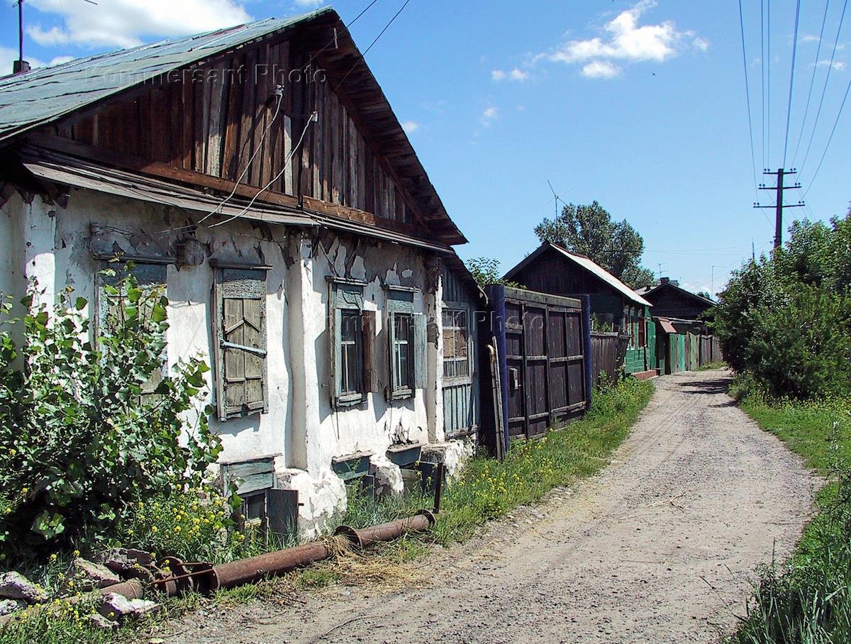 Виды города Минусинска. Надпись "Россия" над старинным бревенчатым домом.