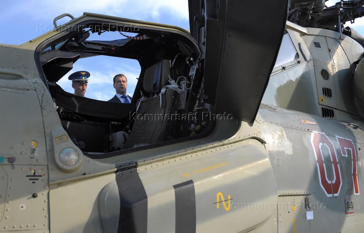 Рабочая поездка президента России Дмитрия Медведева в Южный федеральный округ. Президент России Дмитрий Медведев (справа) во время посещения в городе Кореновске 393-й Севастопольской авиационной базы армейской авиации.