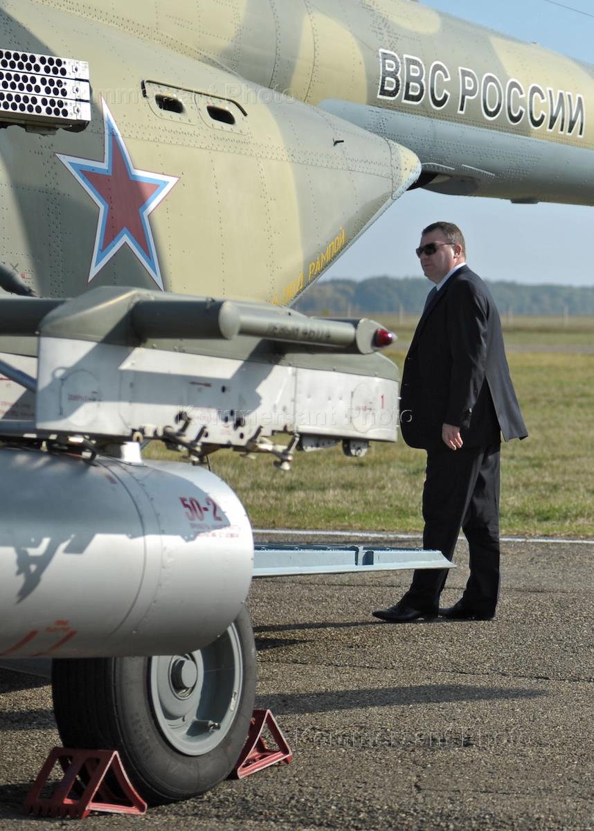 Рабочая поездка президента России Дмитрия Медведева в Южный федеральный округ. Президент России Дмитрий Медведев (справа) во время посещения в городе Кореновске 393-й Севастопольской авиационной базы армейской авиации.