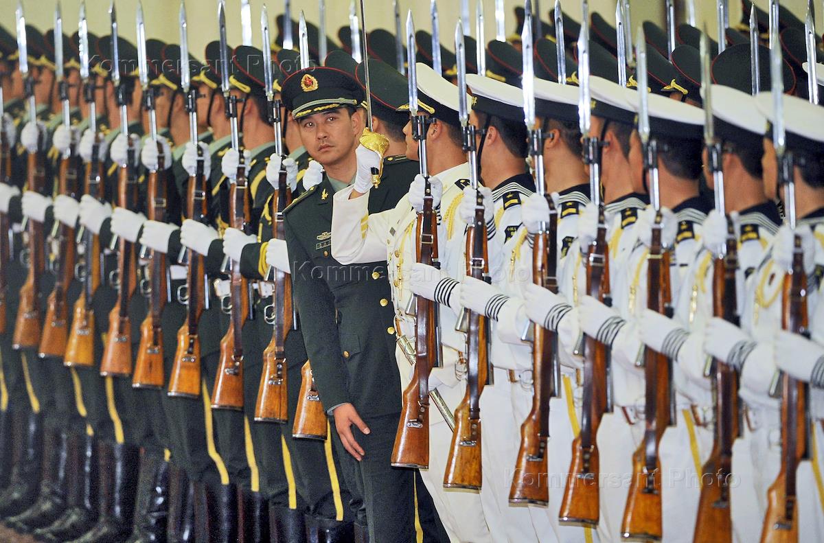 Рота почетного караула на официальной церемонии встречи председателя правительства России Владимира Путина и премьера Государственного совета Китайской Народной Республики (КНР) Вень Цзябао в Доме народных собраний.