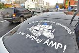 Пикет общества "Синих ведерок" на площадке у дома 10 на проспекте Академика Сахарова. Надпись на заднем стекле автомобиля "дед не пропустил фашистов - я не пропущу АМР!".