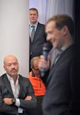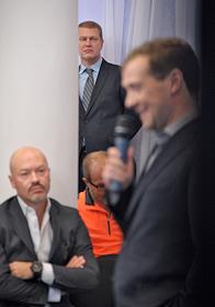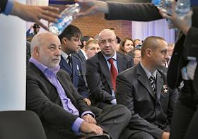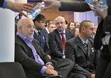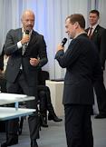 Совладелец группы "Ренова", президент фонда "Сколково" Виктор Вексельберг (слева) и председатель комитета Государственной думы России по конституционному законодательству и государственному строительству Владимир Плигин (в центре) во время встречи президента России Дмитрия Медведева со сторонниками в центре Digital October.