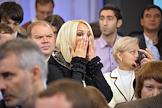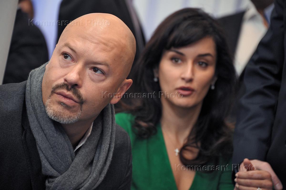 Член высшего Совета партии "Единая Россия", режиссер Федор Бондарчук (слева) и телеведущая Тина Канделаки (справа) во время встречи президента России Дмитрия Медведева со сторонниками в центре Digital October.