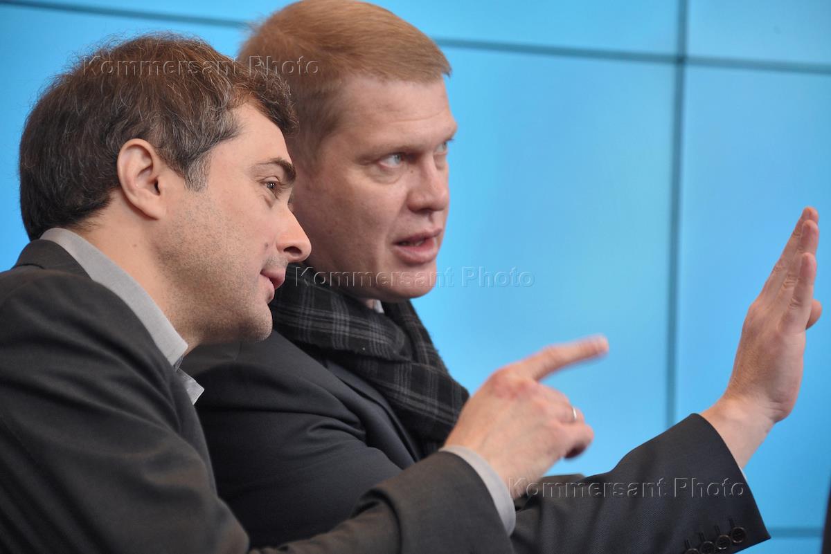 Первый заместитель руководителя администрации президента России Владислав Сурков (слева) и координатор организации "Молодая гвардия" (молодежное крыло партии "Единая Россия") по идеологии и политическим вопросам Иван Демидов (справа) во время встречи президента России Дмитрия Медведева со сторонниками в центре Digital October.