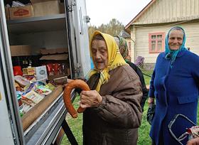 Жительница деревни Кореличского района покупает продукты в автолавке.