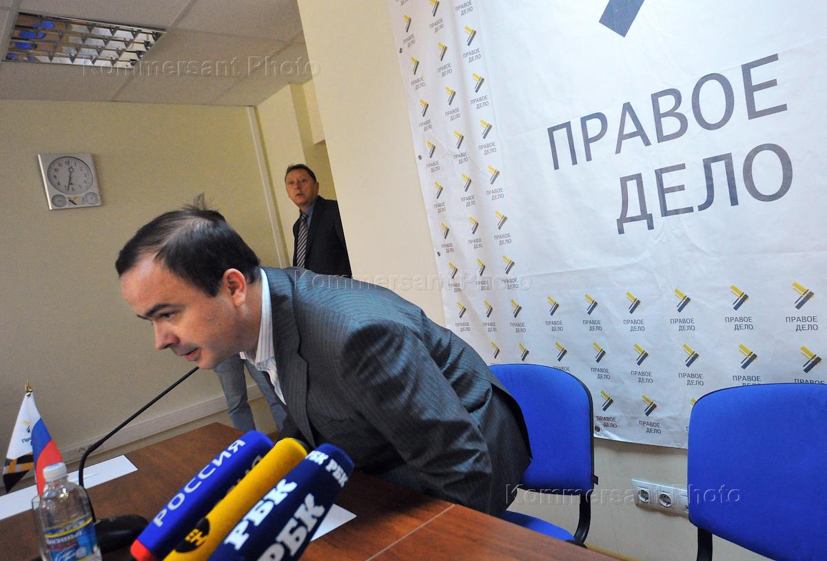 Исполняющий обязанности председателя партии "Правое дело" Андрей Дунаев (справа) перед началом заседания политсовета партии "Правое дело". Заседание прошло в офисе партии.