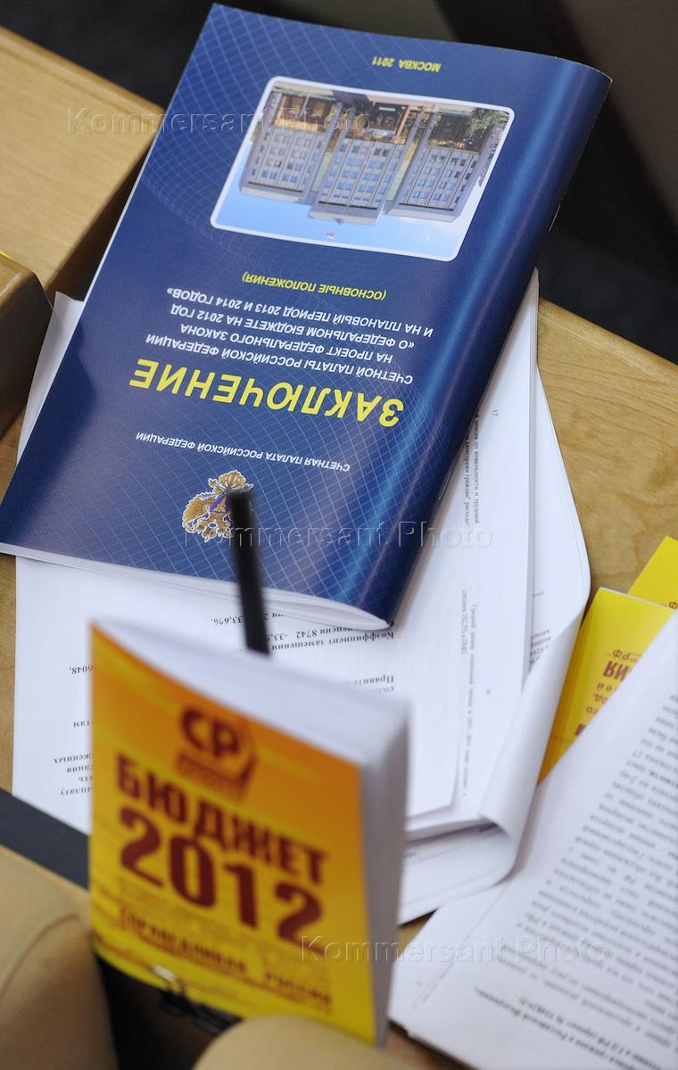 Заседание Государственной думы России. Брошюры "Бюджет 2012" и "Заключение" на столе депутата.