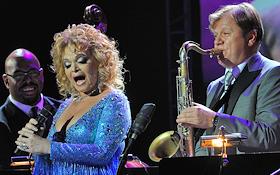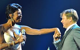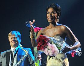 Джазовая певица Натали Коул (слева) во время юбилейного концерта джазового музыканта Игоря Бутмана (справа). Концерт прошел в Государственном Кремлевском дворце.