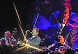 Басист Крисчен Макбрайд (слева) и певица Лариса Долина (в центре) во время юбилейного концерта джазового музыканта Игоря Бутмана (справа). Концерт прошел в Государственном Кремлевском дворце.