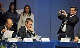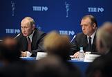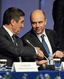 Председатель Совета Союза нефтегазопромышленников России Юрий Шафраник (слева) и исполняющий обязанности министра финансов России Антон Силуанов (справа) на расширенном заседании правления Торгово-промышленной палаты (ТПП) России. Заседание прошло в Центре международной торговли (ЦМТ).