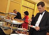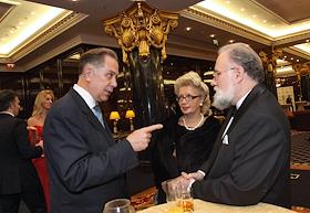 Ректор Московской консерватории Александр Соколов (слева) и председатель Центральной избирательной комиссии (ЦИК) России России Владимир Чуров (справа) на вечеринке по случаю открытия Большого театра после реконструкции в отеле Ritz-Carlton.