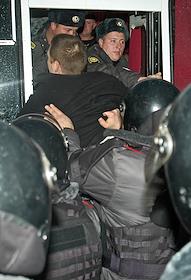 Акция с требованием предоставить возможность оппозиции участвовать в выборах, организованная оргкомитетом "Стратегии-31", прошла на Триумфальной площади. Участники акции в полицейской машине после задержания.