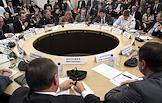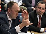 Руководитель Департамента строительства Москвы Андрей Бочкарев (слева) и заместитель руководителя Департамента жилищно-коммунального хозяйства и благоустройства Москвы Евгений Адамов (справа) во время Общественных слушаний на тему "Программа развития транспортной системы Москвы на 2012-2016 годы". Слушания прошли в РИА "Новости".