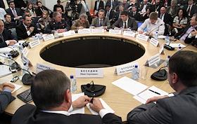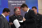Слева направо: руководитель межкомиссионной рабочей группы Общественного совета Москвы по общественному контролю за реализацией программы "Развитие транспортной системы на 2012-2016 годы" Антон Цветков, заместитель мэра Москвы, руководитель департамента транспорта и развития дорожно-транспортной инфраструктуры Москвы Николай Лямов и генеральный директор ГУП "Мосгортранс" Петр Иванов во время Общественных слушаний на тему "Программа развития транспортной системы Москвы на 2012-2016 годы". Слушания прошли в РИА "Новости".