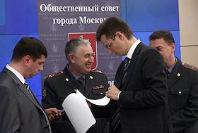 Слева направо: руководитель Государственного учреждения Москвы - Центра организации дорожного движения Правительства Москвы (ГУ ЦОДД) Игорь Королев, заместитель начальника Управления ГИБДД ГУВД города Москвы Владимир Томчак и генеральный директор ГУП "Мосгортранс" Петр Иванов во время Общественных слушаний на тему "Программа развития транспортной системы Москвы на 2012-2016 годы". Слушания прошли в РИА "Новости".