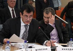 Вице-президент Ассоциации строителей автоматизированных паркингов Ян Качко (слева) и руководитель исполкома МГО "Деловая Россия" Владимир Микеда (справа) во время Общественных слушаний на тему "Программа развития транспортной системы Москвы на 2012-2016 годы". Слушания прошли в РИА "Новости".