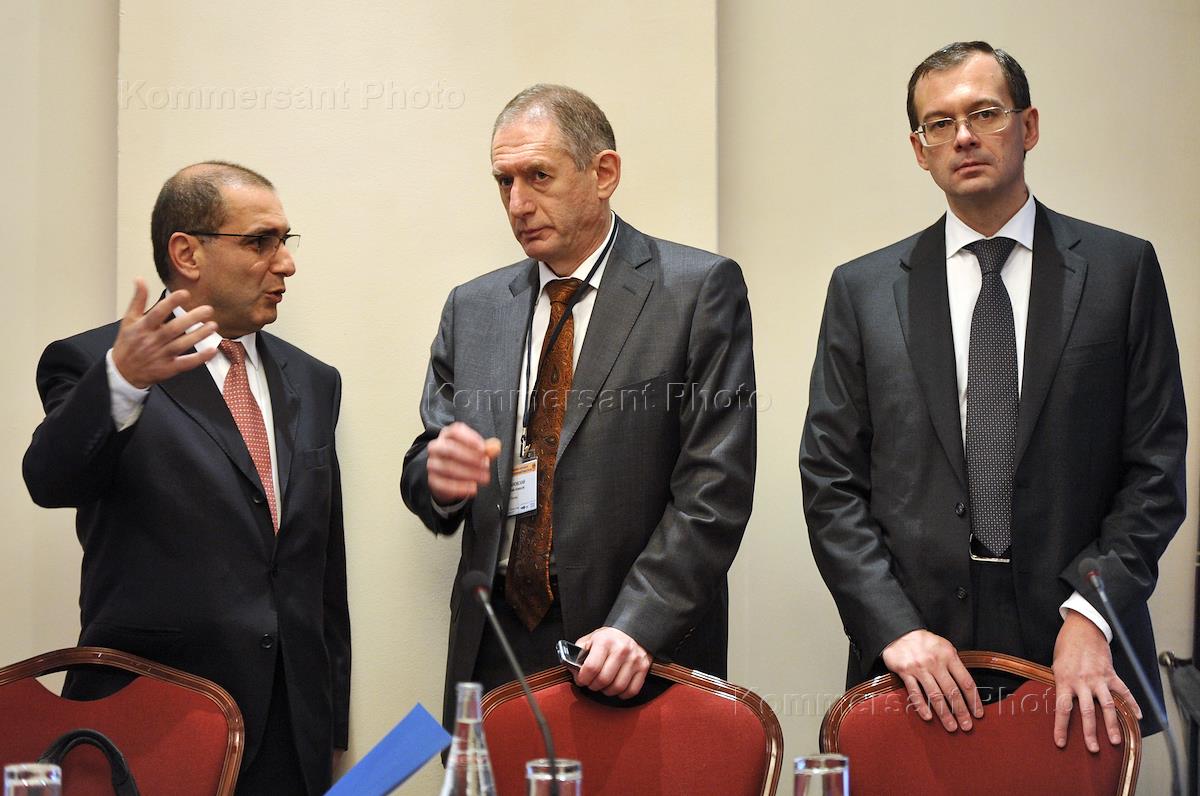 Слева направо: президент Ассоциации Российских банков (АРБ) Гарегин Тосунян, заместитель председателя Банка России Алексей Симановский и директор департамента лицензирования деятельности и финансового оздоровления кредитных организаций Банка России Михаил Сухов во время встречи с руководителями российских банков на тему: "Регулирование деятельности кредитных организаций Банком России". Встреча прошла в "Марриотт Гранд-Отеле".