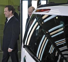 Председатель правительства России Владимир Путин (слева) и президент России Дмитрий Медведев (справа) во время посещения Горьковского автомобильного завода (ГАЗ).