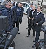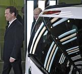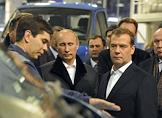 Председатель правительства России Владимир Путин (второй слева) и президент России Дмитрий Медведев (в центре) и губернатор Нижегородской области Валерий Шанцев (справа) во время посещения Горьковского автомобильного завода (ГАЗ).