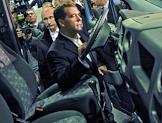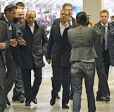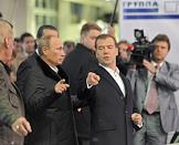 Председатель правительства России Владимир Путин (слева), президент России Дмитрий Медведев (третий слева) и губернатор Нижегородской области Валерий Шанцев (третий справа) во время посещения Горьковского автомобильного завода (ГАЗ).