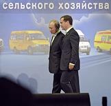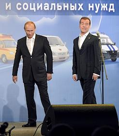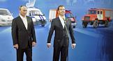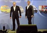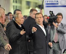 Председатель правительства России Владимир Путин (слева) и президент России Дмитрий Медведев (справа) во время посещения Горьковского автомобильного завода (ГАЗ).