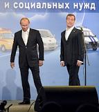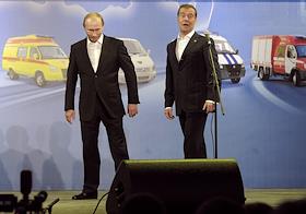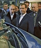 Президент России Дмитрий Медведев (слева) и председатель правительства России Владимир Путин (справа) во время посещения Горьковского автомобильного завода (ГАЗ).