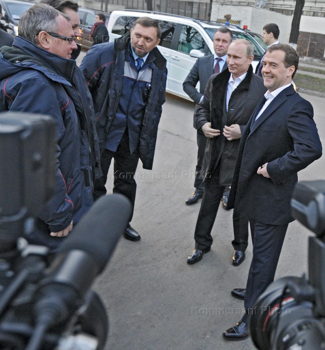 Председатель правления "ВТБ Банк" Андрей Костин (слева), владелец холдинга "Базовый элемент", генеральный директор компании "РУСАЛ" Олег Дерипаска (второй слева), председатель правительства России Владимир Путин (второй справа) и президент России Дмитрий Медведев (справа) во время посещения Горьковского автомобильного завода (ГАЗ).