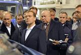 Председатель правительства России Владимир Путин (в центре) и президент России Дмитрий Медведев (справа) во время посещения Горьковского автомобильного завода (ГАЗ).