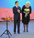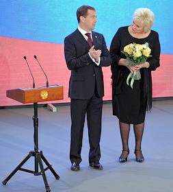Президент России Дмитрий Медведев (слева) и эстонская певица Анне Вески (справа) на церемонии вручения Государственных наград в здании выставочного центра "Нижегородская ярмарка". Анне Вески удостоена ордена Дружбы.