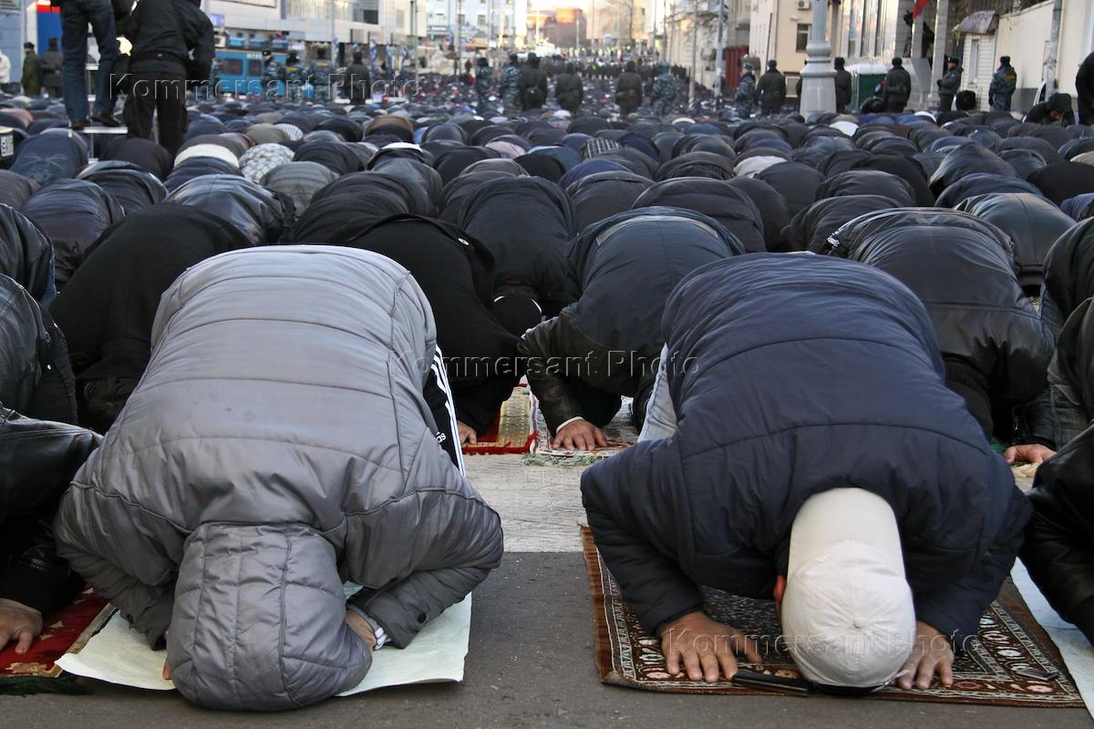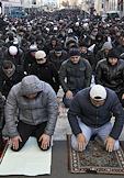 Празднование мусульманского праздника "Курбан-байрам" в Соборной мечети. Верующие во время молитвы.