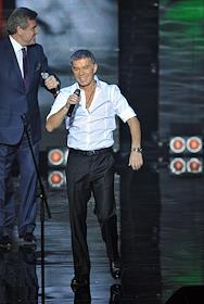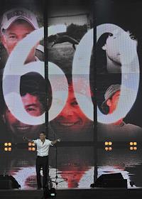 Певец Лев Лещенко (слева) и певец Олег Газманов (справа) во время выступления на сольном юбилейном концерте, посвященному своему 60-летию. Концерт прошел в концертном зале Crocus City Hall.