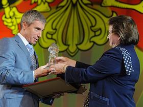 Руководитель Центра подготовки космонавтов имени Ю.А. Гагарина, космонавт Сергей Крикалев (слева) и первая женщина-космонавт, депутат Ярославской областной думы от партии "Единая Россия" Валентина Терешкова (справа) на церемонии награждения лауреатов VI Национальной премии общественного признания достижений граждан России "Россиянин года". Церемония прошла в большом конференц-зале администрации президента Россиии.