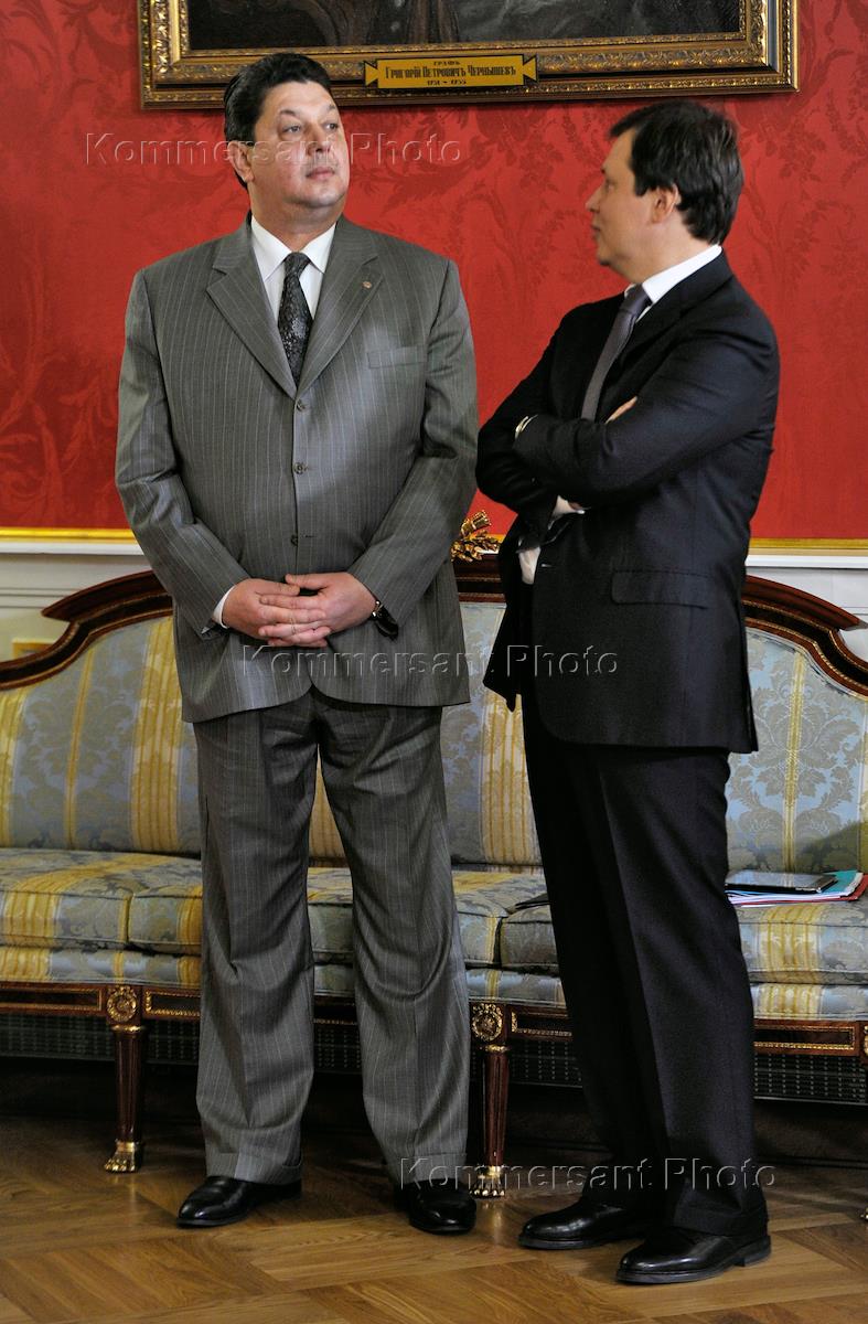 Вице-президент ОАО "РЖД" по пассажирским перевозкам - генеральный директор ОАО "Федеральная пассажирская компания" Михаил Акулов (слева) и начальник Дирекции железнодорожных вокзалов ОАО "РЖД" Сергей Абрамов (справа) во время церемонии подписания соглашения между правительством Москвы и РЖД о сотрудничестве в области реализации проектов создания в городе Москве транспортно-пересадочных узлов. Церемония подписания прошла в мэрии.
