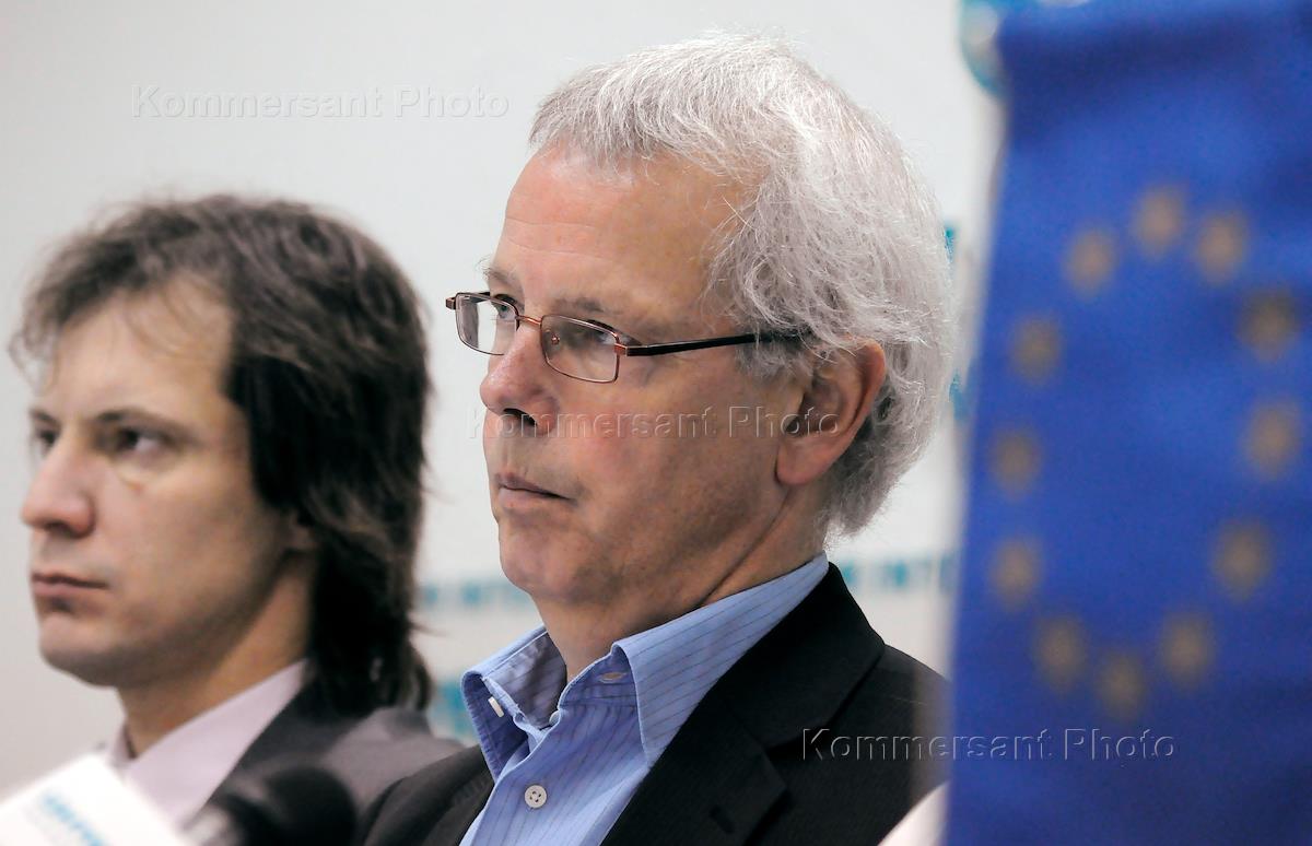 Вице-председатель Социал-демократической партии Эстонии Индрек Саар (слева) и руководитель миссии наблюдателей Парламентской ассамблеи Совета Европы (ПАСЕ) на предстоящих выборах в Госдуму Тини Кокс (справа) во время пресс-конференции на тему: "Итоги визита в Россию". Пресс-конференция прошла в центральном офисе агентства "Интерфакс".